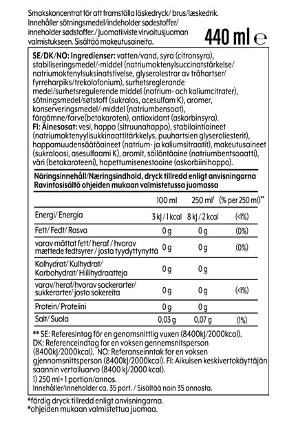 SodaStream Mirinda Light 440 ml Smakkoncentrat för att framställa kolsyrad sockerfri dryck med apelsinsmak. Ger upp till 9 L färdig dryck.