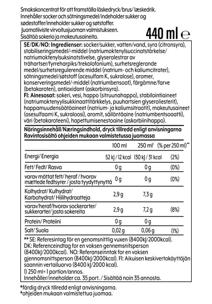 Smakkoncentrat för att framställa kolsyrad dryck med apelsinsmak. Ger upp till 9 L färdig dryck.