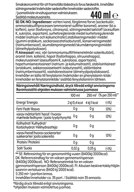 Ingredienser: vatten, färgämne (ammonierat sulfiterat karamel), syra (fosforsyra, citronsyra), surhetsregulatorer (natriumcitrater, kaliumcitrat), sötningsmedel (acesulfam K, sukralos, aspartam), aromer (bl.a. koffein), konserveringsmedel (natriumbenzoat), skumdämpningsmedel (dimethylpolysiloxan).
