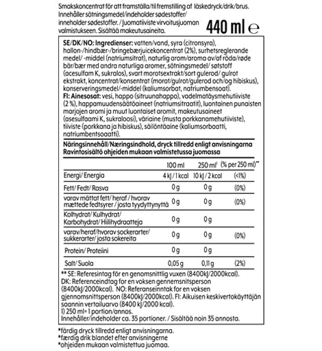 Flaskan innehåller 440 ml som ger ca 9 liter färdig dryck.