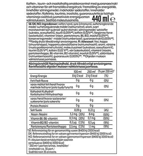 Smaksättare för kolsyrat vatten för att framställa sockerfri energidryck med tropisk fruktsmak. Rockstar är ett varumärke från PepsiCo. Innehåller koffein, taurin och b-vitamin som minskar trötthet. Flaskan innehåller 440 ml som ger ca 9 liter färdig dryck. Förvaras på en sval och torr plats och efter öppning i kylskåp. Skakas före användning.