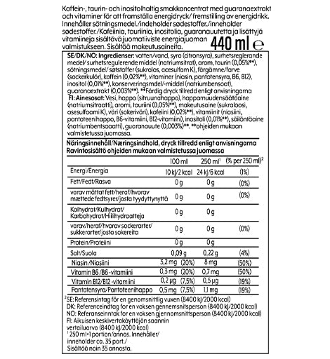 Smaksättare för kolsyrat vatten för att framställa sockerfri energidryck. Rockstar är ett varumärke från PepsiCo. Innehåller koffein, taurin och b-vitamin som minskar trötthet. Flaskan innehåller 440 ml som ger ca 9 liter färdig dryck. Förvaras på en sval och torr plats och efter öppning i kylskåp. Skakas före användning.